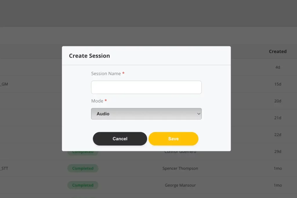 select the create session button. Enter a name for the session and select a mode, i.e. (audio, motion, etc.)
